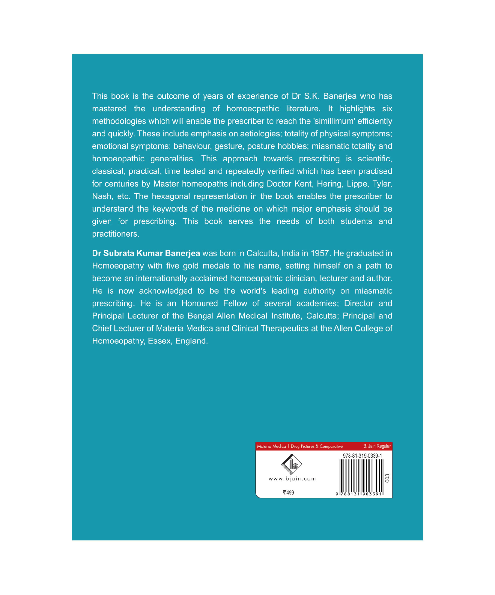 The hexagonal representation in the book will enable the prescriber to understand the keywords of the medicine (for example, ‘Retention’ for Natrium muriaticum; ‘Anchor’ for Pulsatilla nigricans; ‘Principle’ for Kalium carbonicum; ‘Unfulfilled’ for Tuberculinum, etc.) on which major emphasis should be given for prescribing. The book gives a graphic presentation of all the drugs which is easy to comprehend and remember too. There is a discussion on different concepts of homeopathy needed for a correct prescription ranging from miasms, case taking, use of mother tinctures, LM potency, common characters of different groups, polychrest remedies etc.